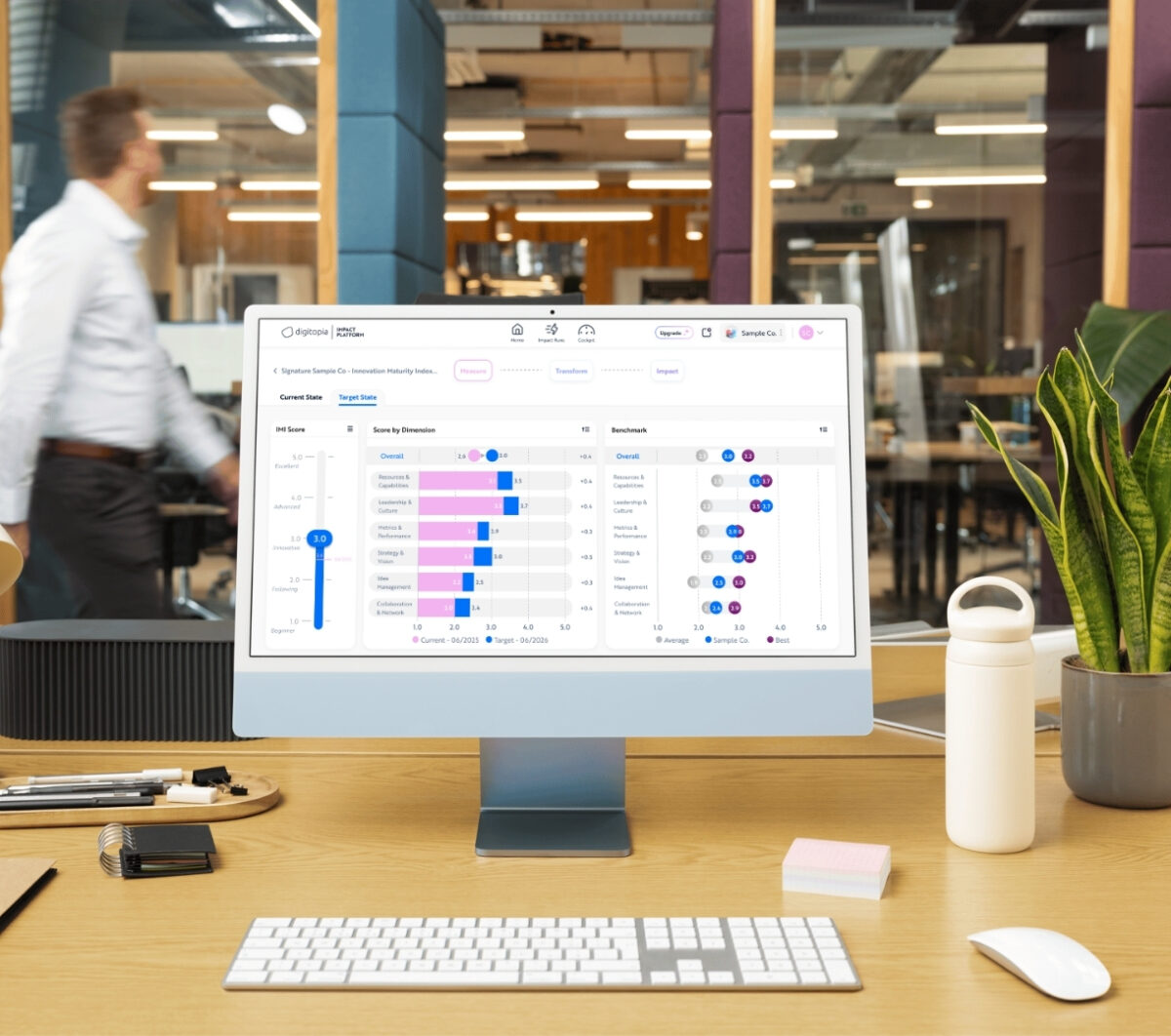 - Benchmark digital and AI maturity across six core dimensions